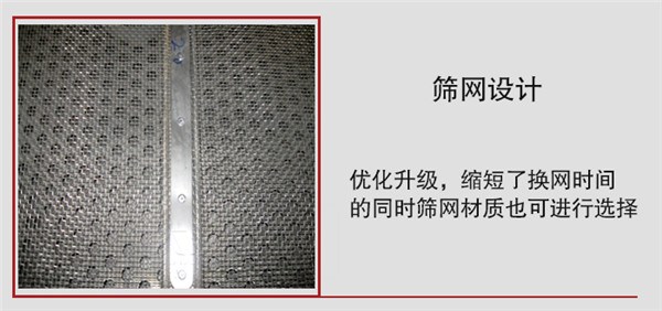 3,篩網(wǎng)設(shè)計(jì)進(jìn)行優(yōu)化升級(jí),縮短了換網(wǎng)時(shí)間的同時(shí)篩網(wǎng)材質(zhì)也可進(jìn)行選擇。