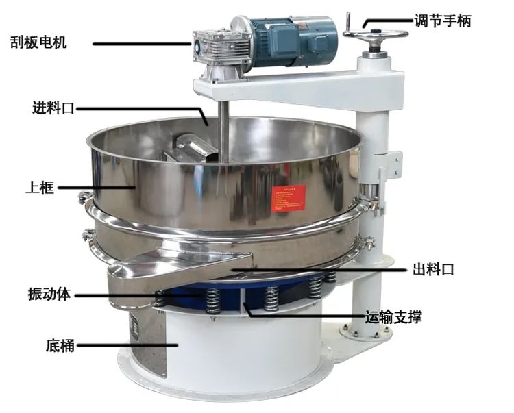 便于加強振動篩篩網的自清潔功能,例 如在面粉篩分中,有些細渣子易于掉落在網孔中,在刮板旋轉推動的作用下,