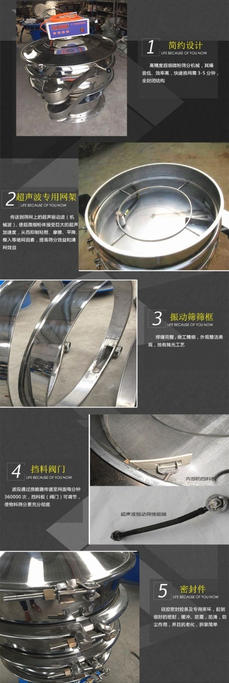 超聲波振動篩是將220V、50Hz或110V、60Hz電能轉化為36KHz的高頻電能,輸入超聲換能器,將其變成36KHz機械振動,產生的功率超聲波使篩網作高頻振動。篩網上的物料在作低頻旋振運動的同時,疊加上超聲振動,既可防止網孔堵塞,又可使篩分機提高產量和質量,從而達到快速篩分和清網的目的,使超微細粉篩分成為易事。該系統在傳統的振動篩基礎上在篩網上引入一個低振幅、高頻率的超聲振動波(機械波),以改變超微細分體的篩分性能。特別適合高附加值精細分體的用戶使用